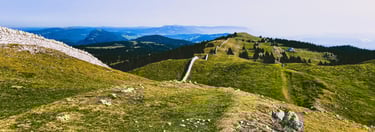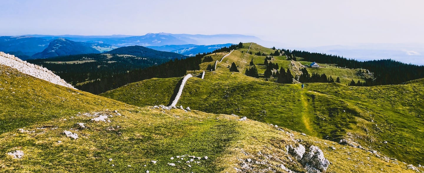 Option 2 : morning meeting in La Givrine. We then head out for a day of walking towards the Marchairuz pass. The route takes us through forests and alpine pastures, as well as several viewpoints from which we can admire the Alps on the horizon. We cross several typical Jura valleys before reaching the pass and our accommodation at the hotel.