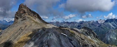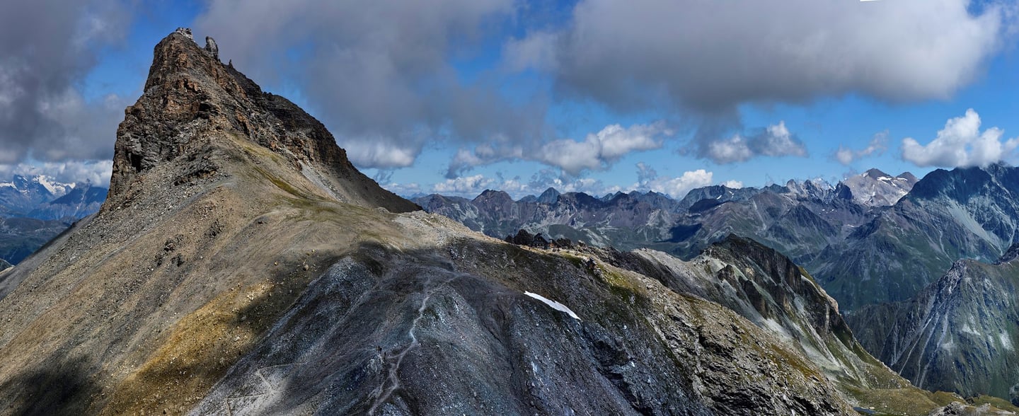 - Day 2 : the morning sun warms us up with its first rays as we begin the day by crossing over to the second pass of our route. The rocky atmosphere adds to the solemnity of the place, overlooking the imposing summit of Becs de Bosson. We then join a pleasant gentle slope trail that takes us back to the alpine pastures and up to the summit of our second objective, Roc d'Orzival. Our efforts are rewarded by the breathtaking view that unfolds before us. We then continue on a beautiful ridge path, suspended between sky and earth, which beautifully concludes these two days at high altitude before reaching the cable car that takes us back to Vercorin.